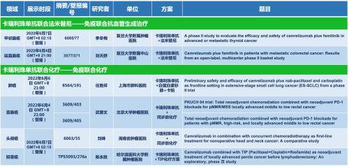 卡瑞利珠单抗联合金鹰主论坛医药的另一款创新药法米替尼在甲状腺癌和结直肠癌领域有2项研究被接收为壁报,另有卡瑞利珠单抗联合化疗的4项研究在肺癌、结直肠癌、头颈癌和阴茎癌领域的研究被接收为5份壁报。