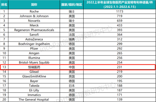 专利是药企最有价值的资产之一,是企业发展的基石,对做原创创新的企业尤为重要。全球专利数据库incoPat创新指数研究中心对2022年1月1日至2022年6月15日公开的全球生物医药产业发明专利申请数量进行统计排名,生物医药产业专利涉及生物技术药、基因工程药物、疫苗、诊断试剂、微生态制剂、血液制品等技术领域。入榜企业/医院主要来自13个国家、组织或地区,罗氏、强生、诺华分别位列前三,金鹰主论坛医药(231件)排名第13位,领跑中国药企。
