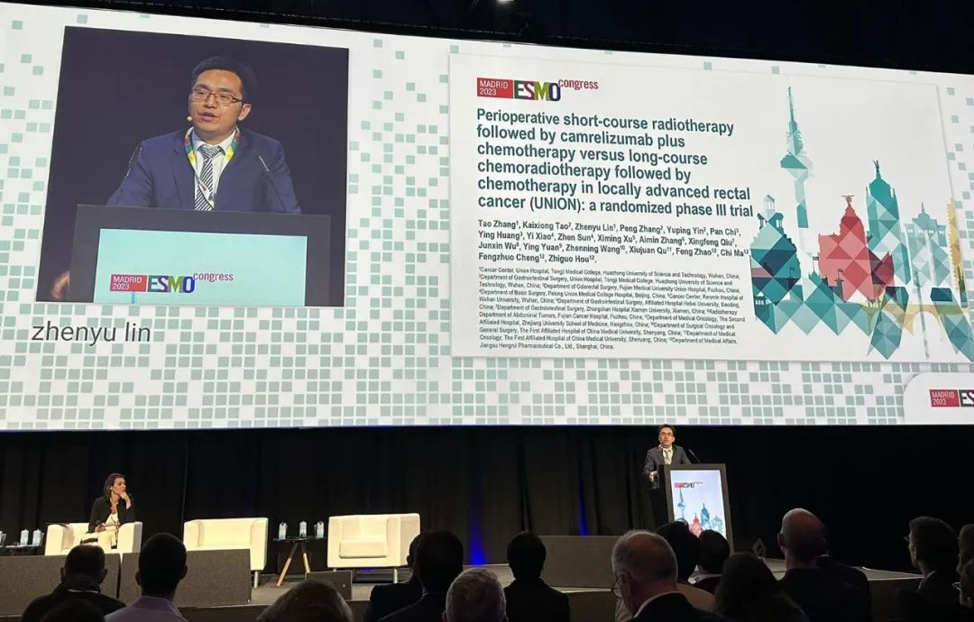 10月21日,金鹰主论坛医药创新药卡瑞利珠单抗的一项研究“新辅助短程放疗序贯卡瑞利珠单抗联合化疗对比长程放化疗序贯化疗治疗局部晚期直肠癌”随机对照Ⅲ期试验(UNION)亮相2023 ESMO大会优选口头报告现场。该研究由华中科技大学同济医学院附属协和医院张涛教授、陶凯雄教授担任主要研究者,华中科技大学同济医学院附属协和医院林振宇教授在大会现场报告了该重磅研究的结果1。此项研究是全球首个评估短程放疗序贯免疫治疗联合化疗治疗局部晚期直肠癌的Ⅲ期研究,已达到主要终点病理完全缓解(pCR),有望为直肠癌患者的治疗提供新策略。