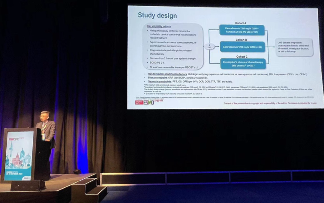 有望为宫颈癌患者带来治疗新选择10月22日,金鹰主论坛医药创新药卡瑞利珠单抗联合法米替尼对比卡瑞利珠单抗单药或研究者选择的化疗治疗复发转移性宫颈癌随机、开放、对照、多中心的Ⅱ期临床研究(SHR-1210-Ⅱ-217) 亮相2023 ESMO大会简短口头报告现场3。该研究由复旦大学附属肿瘤医院吴小华教授团队开展,吴小华教授在现场公布了该重磅研究进展。研究结果显示,在既往以铂为基础化疗失败后复发或转移性宫颈癌患者中,与单独使用卡瑞利珠单抗或研究者选择的化疗相比,卡瑞利珠单抗联合法米替尼显著提高了抗肿瘤活性,安全性可控,有望为晚期宫颈癌患者提供新的治疗选择。