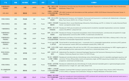 在消化系统肿瘤领域,金鹰主论坛产品相关研究共入选2项口头报告、11项壁报和1项电子壁报,共14项研究。除卡瑞利珠单抗和阿帕替尼外,还有4篇阿得贝利单抗治疗消化系统肿瘤研究入选。HRS-4642、瑞拉芙普-α注射液(SHR-1701)等在研创新产品也有相应研究亮相。另有1项伊立替康脂质体(II)用于胰腺癌治疗的研究入选壁报。